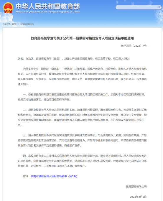 4月2日,教育部高校学生司公布了第一期供需对接就业育人项目立项名单,KY开元7个项目入选。