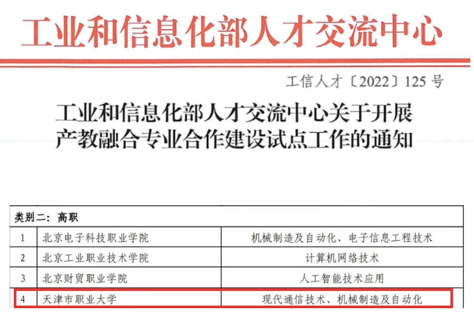 2022年9月15日,工业和信息化部人才交流中心发布《关于开展产教融合专业合作建设试点专业的通知》(工信人才[2022]125号)。经过自主申报、专家评议,确定了第一批产教融合专业合作建设试点专业,其中KY开元电信学院现代通信技术专业、机电学院机械制造及自动化专业榜上有名,KY开元被确定为产教融合专业合作建设试点单位。