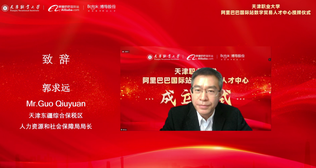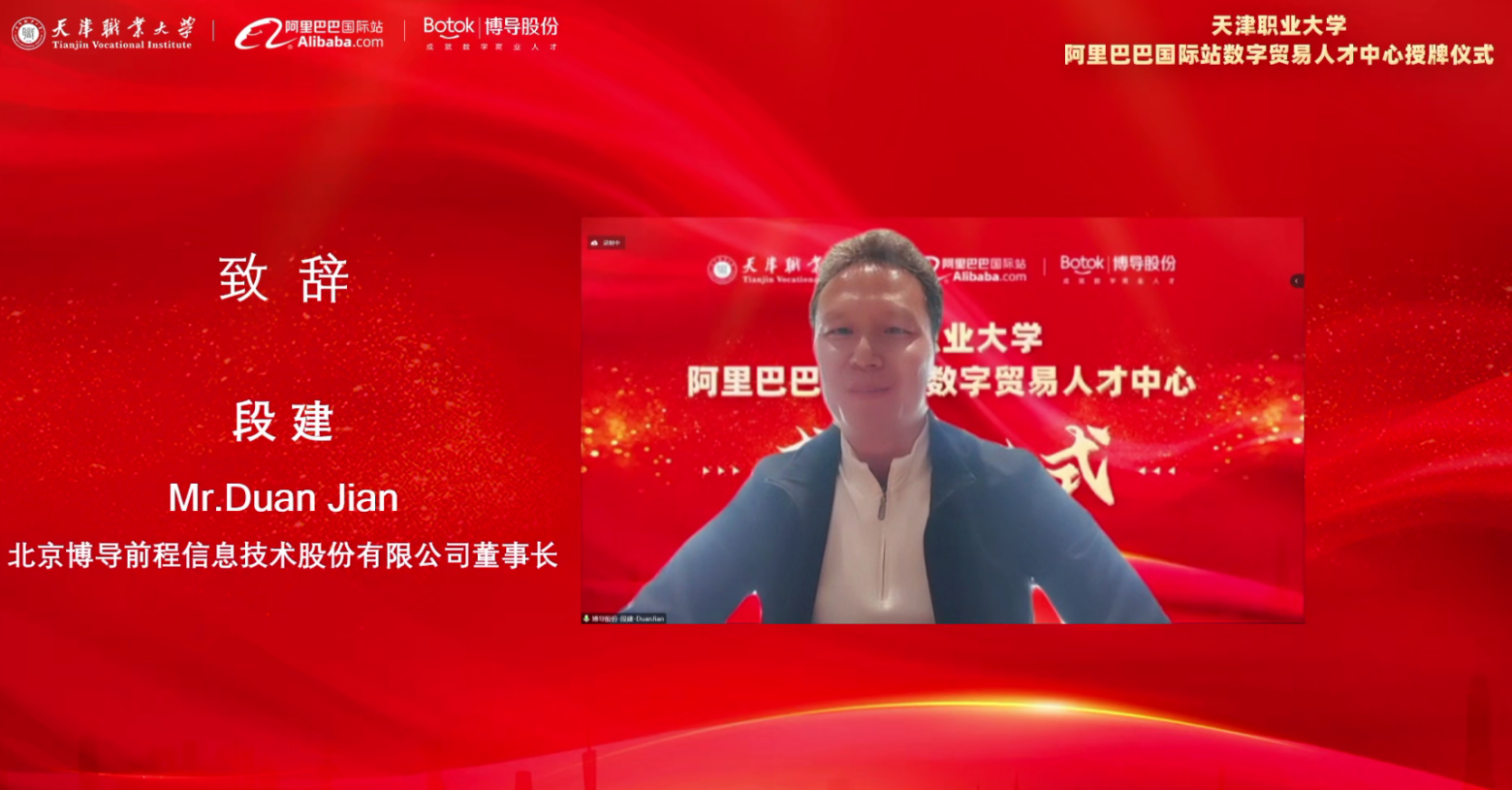 会议由经管学院院长杨国良主持。会议伊始,郑清春校长发表致辞,表示阿里巴巴国际站数字贸易人才中心的成立是校企深度合作的结晶,它可以充分发挥龙头企业和双高示范校的优势,打造高水平的产教融合育人环境,推进人才培养供给侧和产业需求侧全方位融合。郑校长指出,人才中心的建设要紧密围绕服务区域经济社会发展的目标,积极创新现代学徒制人才培养模式,充分发掘和利用校企双方的资源,以国际化标准共育出符合天津经济发展需要的国际电子商务人才。