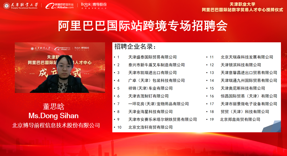 成立仪式结束后,阿里巴巴国际站和博导公司为经管学院2023届毕业生安排了跨境电商线上专场招聘会。此次招聘会汇集了阿里巴巴国际站北方大区19家头部企业,涉及外贸业务员、跨境电商运营专员、跨境主播、跨境供应链销售等150余个工作岗位。国商、电商、物流专业的200余名同学向有意向的企业线上投递了简历并与企业负责人进行了线上沟通,后续企业将对符合应聘要求的同学开展面试和笔试。