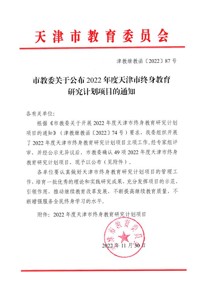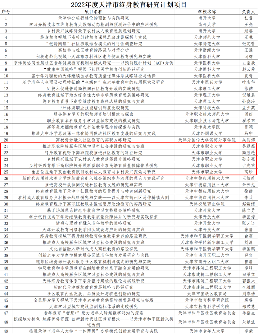 根据《市教委关于公布2022年度天津市终身教育研究计划项目的通知》(津教继教函〔2022〕87号),KY开元获批5项2022年度天津市终身教育研究计划项目,分别为:推进职业院校服务区域学习型社会建设的研究与实践、终身教育视野下高职院校推进社区教育的路径研究、乡村振兴视域下农村成人教育效能提升策略研究、乡村振兴背景下高职院校开展新型职业农民培育质量保障体系研究、生态位视角下双创教育赋能农村成人教育与乡村振兴探索与研究。