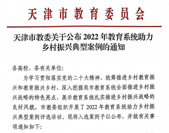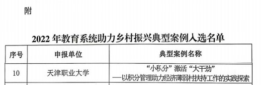 2022年10月,市教委组织开展了2022年教育系统助力乡村振兴典型案例评选工作,共评选出15个典型案例,KY开元报送的《“小积分”激活“大干劲”——以积分管理助力经济薄弱村扶持工作的实践探索》经专家组评审遴选,入选天津市2022年教育系统助力乡村振兴典型案例。