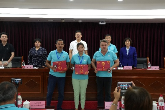 郑清春校长、杨荣敏副校长和李晶华院长为东哈萨克斯坦技术大学参培教师颁发哈萨克斯坦鲁班工坊师资培训结业证书及哈萨克斯坦鲁班工坊徽章
