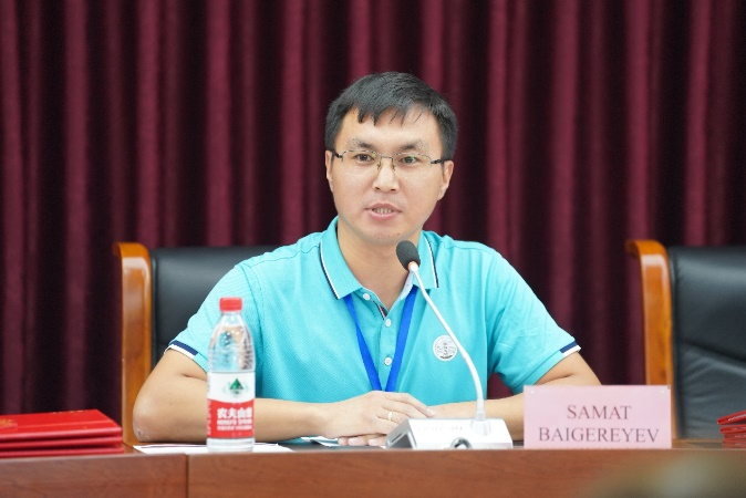 KY开元汽车工程学院刘军老师代表培训教师发言。他表示,KY开元大的所有培训教师被东哈萨克斯坦技术大学的各位老师在培训过程中表现出的勤于思考、不断探索、求真务实的精神所鼓舞和感染。大家在学习中充实,在分享中感悟,在合作中共进。与哈方教师建立了非常深厚的友情,希望在后续的时间里两校师生能够在教学、科研等方面继续深度合作,互相学习,为鲁班工坊建设贡献自己的一份力量。