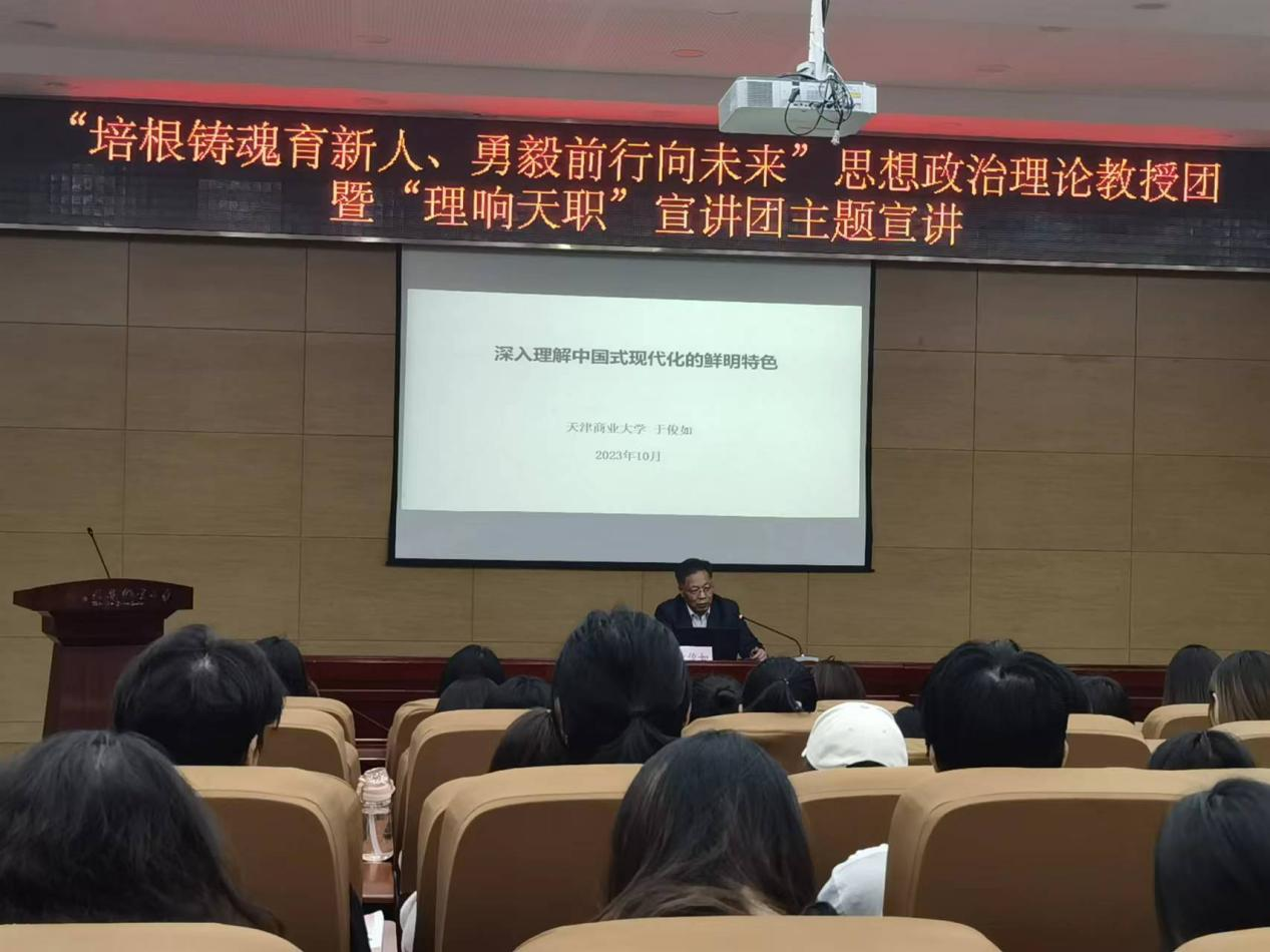 于教授从回顾中国共产党带领中国人民探索现代化道路的艰辛历程出发,从重要特征、本质要求及重大意义等方面深入阐述了“中国式现代化”的历史逻辑、理论逻辑及实践逻辑,带领师生精准把握“以中国式现代化全面推进中华民族伟大复兴”的深刻意义。于教授指出,中国式现代化的鲜明特色在于人口规模巨大、全体人民共同富裕、物质文明和精神文明相协调、人与自然和谐共生以及走和平发展道路,而这些特色既是中国式现代化的重要特征,也是其显著优势。于教授强调,“中国式现代化”理论是习近平新时代中国特色社会主义思想的重要组成部分,“中国式现代化”道路是强国建设、民族复兴的康庄大道,也是唯一正确道路,“中国式现代化”事业是探索性和开创性的事业,需要我们以顽强斗争去打开事业发展新天地。