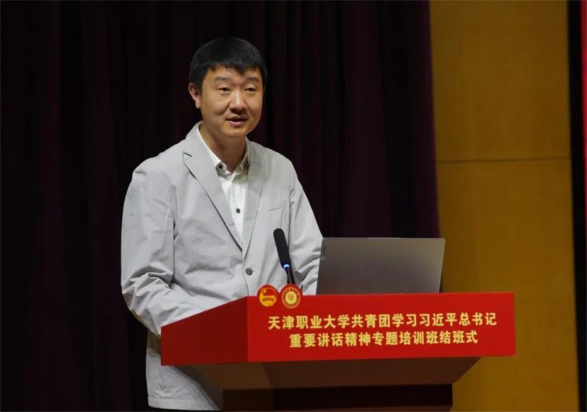 学员代表旅游学院学生团干部单琳和教师团干部代表经管学院团委副书记袁晓瑢分别做专题学习成果微宣讲,分享了学习体会与收获,鼓励大家刻苦学习、知行合一、为校争光。汽车学院梁正昌、赵武英、艺工学院徐畅、机电学院甘齐昊、电信学院赵庆祖作为四次实践活动的主要成员,展示了滨海新区爱津留津岗位认知,北辰区为老志愿服务、“青年之家”读书会、宝坻区乡村振兴等四次实践体验类主题团日活动的学习成果,让大家感受到大学生活的精彩,体会到实践锻炼的重要意义,通过深入基层、走访调研,既能提升社会化能力,更能学有所用,发挥好专业技能优势,助力区域精神文明建设。
