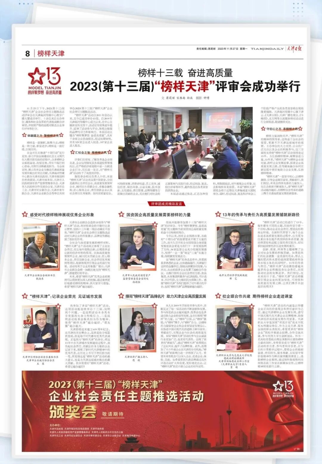 近日,2023(第十三届)“榜样天津”企业社会责任主题推选活动评审会在天津海河传媒中心数字广播大厦成功举行。马克思主义学院思政课教师贾超作为评审团成员参加了活动并发言。