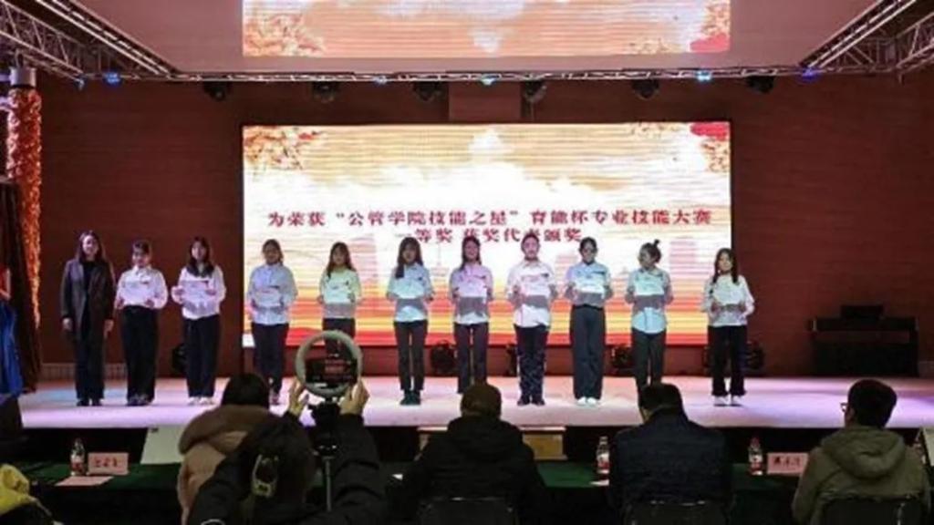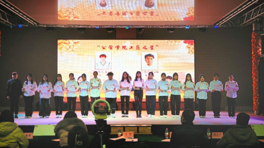 公共管理学院院长及学院班子成员、师生代表共300余人参加了本次活动。学工部老师、旅游管理学院党委副书记也受邀参加了本次活动。公共管理学院首届“海河”文化艺术节暨职业技能大赛表彰大会共分为理想、本领、担当、奋斗四个篇章,涵盖了舞蹈、乐器、戏曲、朗诵等多种艺术表演形式,对在国家级技能大赛、行业大赛以及“育能杯”专业技能大赛中涌现出的优秀个人进行表彰并授予“公管学院工匠之星”、“公管学院技能之星”的荣誉称号。近两个小时的活动让参加活动的同学们收获满满,享受文化盛宴的同时,立志技能报国。