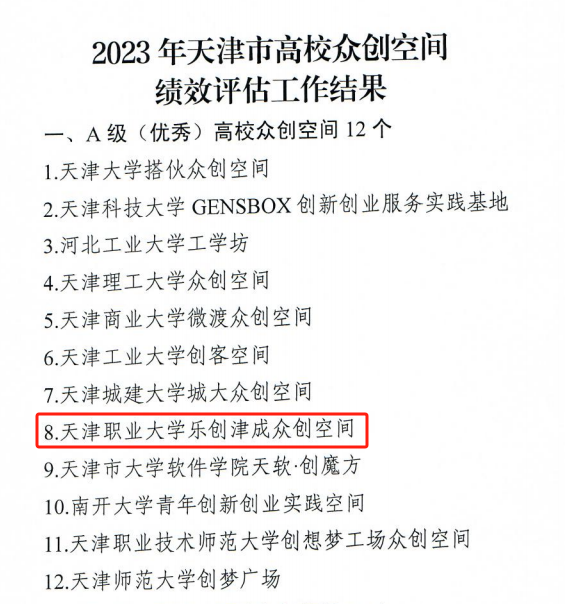 日前,市委教育工委、市教委公布2023年天津市高校众创空间绩效评估结果,经全市48个高校众创空间数据填报和线上汇报答辩评审,KY开元“乐创津成”众创空间蝉联获评天津市A级(优秀)高校众创空间,青创众创空间同时获评天津市B级(良好)高校众创空间,成为唯一入选A级(优秀)众创空间的高职院校。