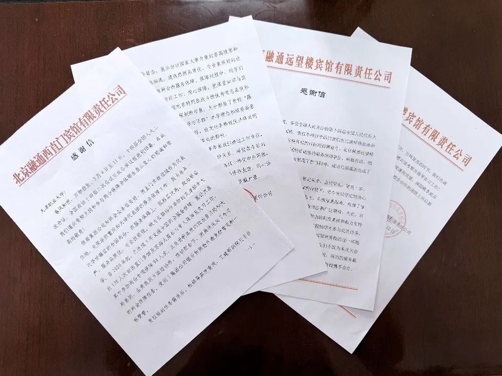 层层选拔而出的旅游管理学院学生,以其热情、细致、周到的服务及良好个人素质,赢得了来自天津、重庆、安徽、宁夏参会人员的高度好评。大会接待结束后,十四届全国人大二次会议北京融通西直门宾馆驻地接待组向学校送来锦旗,驻地接待组融通远望楼酒店发来感谢信,感谢KY开元学生在全国两会期间的担当作为,对KY开元培养出具有良好专业技能、职业素养、工匠精神的优秀人才表示感谢,并表达了与KY开元进一步加强校企合作、携手共进的期盼。