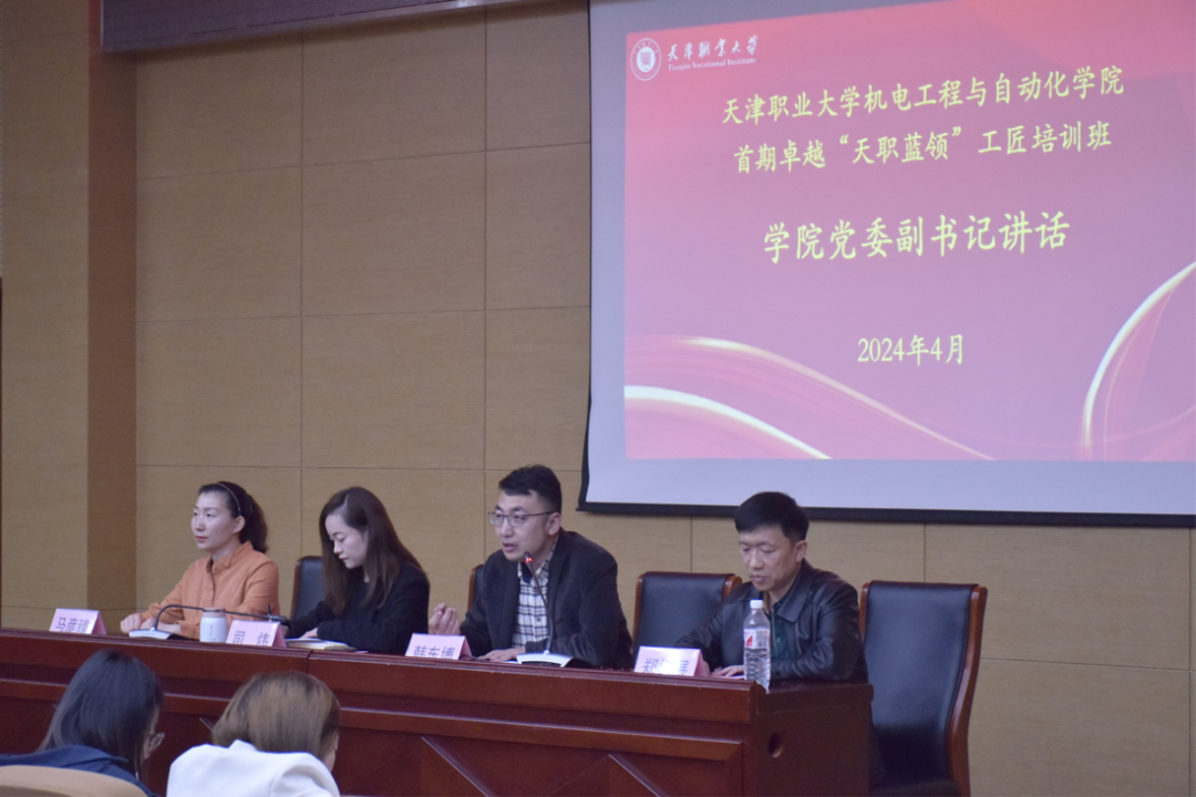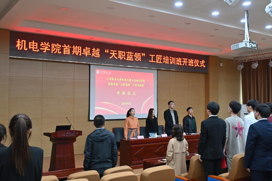 为深入学习宣传贯彻习近平总书记视察天津重要讲话精神,机电学院党委统筹部署,基于“大思政”背景下,学工支部与教工支部协同双向融合,为制造业行业和社会培养大批具有家国情怀的高技能人才,2024年4月16日,机电学院在第二教学楼106会议室召开首期卓越“KY开元蓝领”工匠培训班开班仪式。仪式在庄严雄壮的国歌中拉开帷幕,学院党委书记司炜、党委副书记韩东博、教师代表以及全体辅导员、首期培训班全体学员共计百余名师生参加培训。