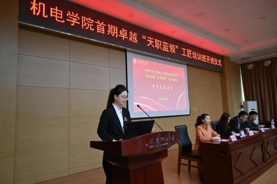 接下来,首届全国大学生职业规划大赛天津市赛金奖获得者、22级模具2班班长查静茹同学作为学员代表发言,号召同学们珍惜学院为大家搭建的平台,全身心投入到培训班的学习中,保持初心,持之以恒,不断提升自己的专业技能和综合素质。