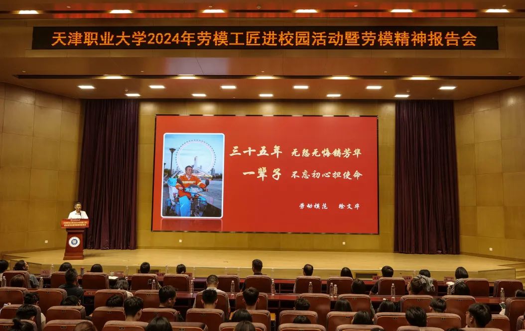 学校邀请了天津市总工会兼职副主席,党的十八大代表、十九大代表、二十大代表,全国五一劳动奖章、全国优秀共产党员、全国优秀农民工、全国环卫行业优秀人物、全国基层理论宣讲先进个人、全国岗位学雷锋标兵、天津楷模等荣誉称号获得者河北区环境卫生管理一所职工徐文华,徐老师在图书馆报告厅给同学们上了一堂生动的爱国主义教育课和劳动教育课。