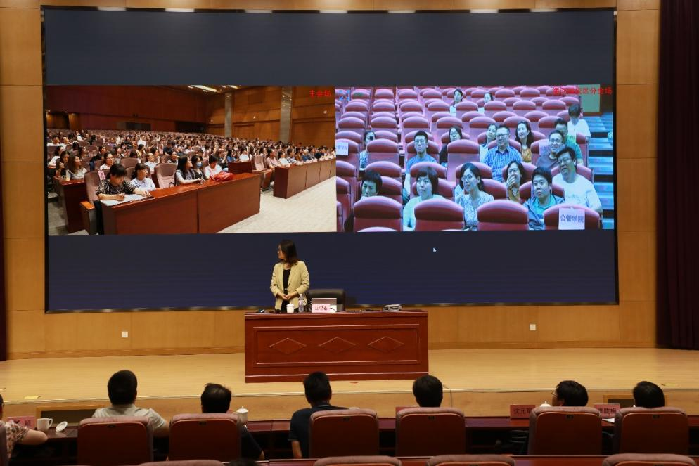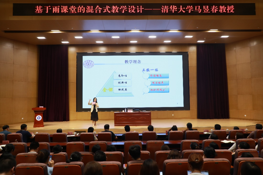 为进一步推动KY开元混合式教学实施,落实教学质量月总体安排,提升KY开元教师混合式教学设计能力。6月19日现代教育中心、教工部、教务处联合举办教学质量月系列活动之混合式教学实施培训会。邀请清华大学教授、清华大学融合式教学指导专家组副组长、北京市青年教学名师、国家级精品在线开放课程《组合数学》负责人马昱春教授来KY开元作了《基于雨课堂的混合式教学设计》的专题讲座。会议采取主校区和海河园校区两个会场同步开展,教务处副处长李海斌主持,学校各学院(部)分管教学工作副院长(副主任)、教学秘书、专业负责人、骨干教师代表以及教务处、现代教育技术中心、教工部、督导中心全体工作人员,近300人聆听了报告
