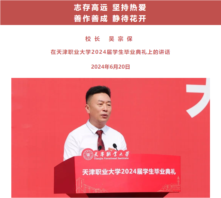 “良工锻炼凡几年,铸得宝剑名龙泉。”即将走向工作岗位的你们,是中国智造、中国创造的主力军。当前世界百年未有之大变局加速演进,以科技创新和产业创新为引领的新质生产力变革,正在加速推进传统产业升级、新兴产业壮大、未来产业培育,让我们切身感受到时代瞬息万变、机遇与挑战并存。未来,谁能够主动作为并持续思考,谁拥有“从0到1”颠覆性的创新能力,谁就可以保持自身的独特竞争优势。希望大家积极拥抱变革,敏锐感知行业趋势,提升职业素养,打磨过硬技能,以“干一行,爱一行,专一行、精一行”的敬业精神,从小处着眼,往深处探究,不断拓展成长通道,真正做到“一技在手,一生无忧”。