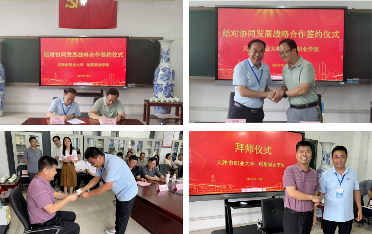 会议中还举行了拜师仪式。冯艳文副校长和史千云副书记分别代表学校双方签署《结对协同发展战略合作》协议。11名徒弟分别向各自师傅敬茶、行拜师礼。