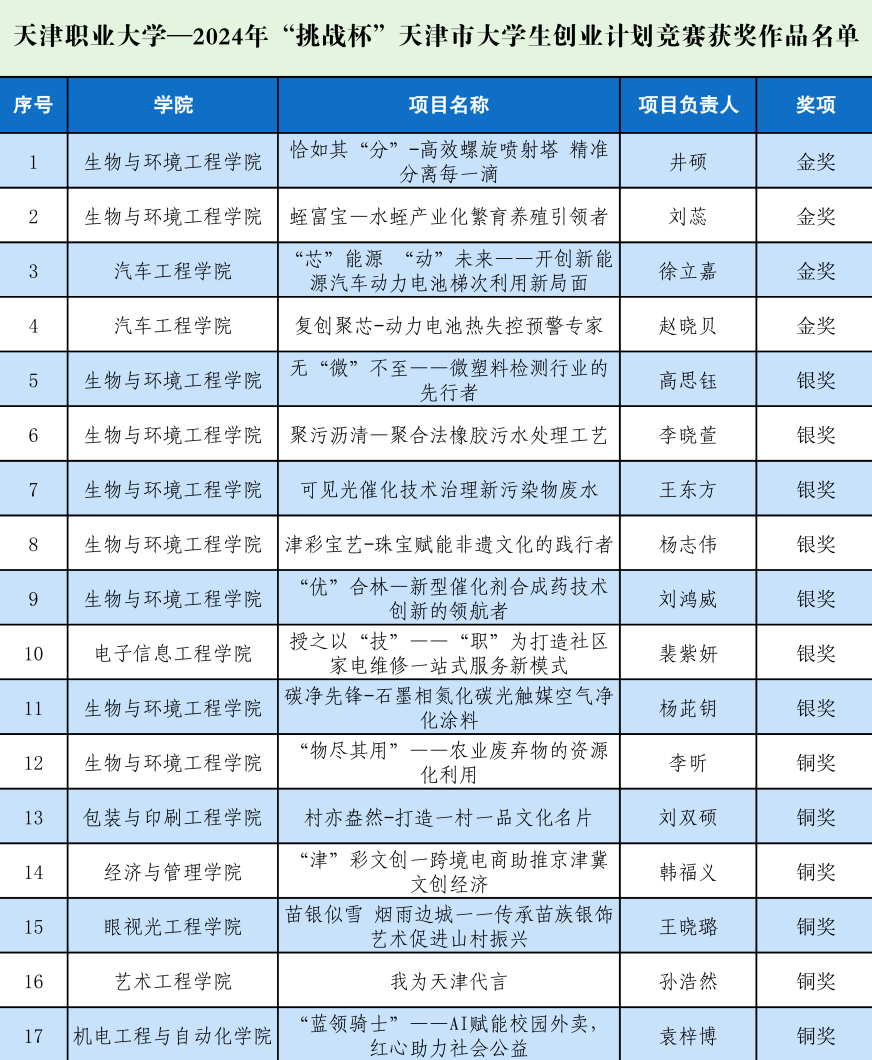 近日,共青团天津市委员会下发《关于2024年“挑战杯”中国银行天津市大学生创业计划竞赛结果的通报》,KY开元入围市赛的18个项目通过市赛网评、终审决赛等环节,最终获得金奖4项、银奖7项、铜奖6项,获奖总数超过上届取得突破,获奖总数和金奖项目均位列高职院校第一,同时获得天津市“优胜杯”和“优秀组织单位”称号。生环学院报送的《蛭富宝—水蛭产业化繁育养殖引领者》、《恰如其“分”-高效螺旋喷射塔 精准分离每一滴》项目、汽车学院报送的《复创聚芯-动力电池热失控预警专家》项目顺利推荐至国赛网评阶段。