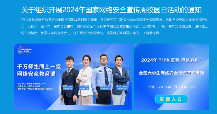 广大师生可在9月10日至15日期间,登录中国大学生在线官网(dxs.moe.gov.cn)观看防范电信诈骗、个人信息保护、规范网络行为等专题网络课程。同时,9月9日至20日通过中国大学生在线官网(dxs.moe.gov.cn)或“中国大学生在线”微信公众号参与“守护青春 网络有你”全国大学生网络安全知识答题活动。师生们可以更加深刻地认识到网络安全的重要性,增强网络安全意识和防范能力。