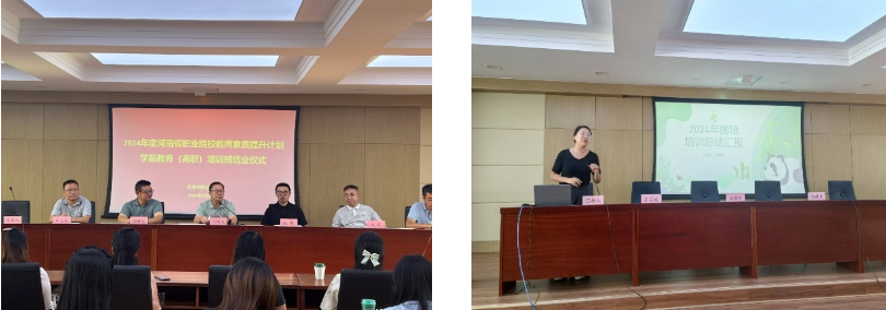 结业仪式前,培训学员代表做了总结汇报,全体学院就培训所得、所想进行了座谈。结业仪式上与会领导共同为全体培训学员颁发结业证书。本期培训班历时28天,项目组紧扣“专业带头人课程实施能力”主题,设计新“双高”、“五金”建设、课程思政、数字赋能、技能大赛等不同理论与实践学习内容,充分整合校内外幼教资源,运用专题讲座、分组实训、实地参观、跟岗研修等多种形式,聘请30余名专家和一线优秀园长参与授课、指导。在培训初期,项目组就职业教育理念、教师师德师风、课程建设等内容对学员进行理论集中培训。在培训中期,积极挖掘天津市幼教资源,带领学员前往和平九幼、引河里幼儿园、津南一幼、河西十六幼、特蕾新幼教集团所属幼儿园以及为明教育集团所属幼儿园等不同特色园所观课评课、跟岗研修,在与各大园长座谈中,更新幼教理念、深挖一线资源,与一线幼儿教育工作者共同学习,共话成长。培训后期,项目组为学员发布任务清单,开展项目实践,学员积极完成课程标准、课程思政案例等任务,系统提升了参训学员课程设计与实施能力。