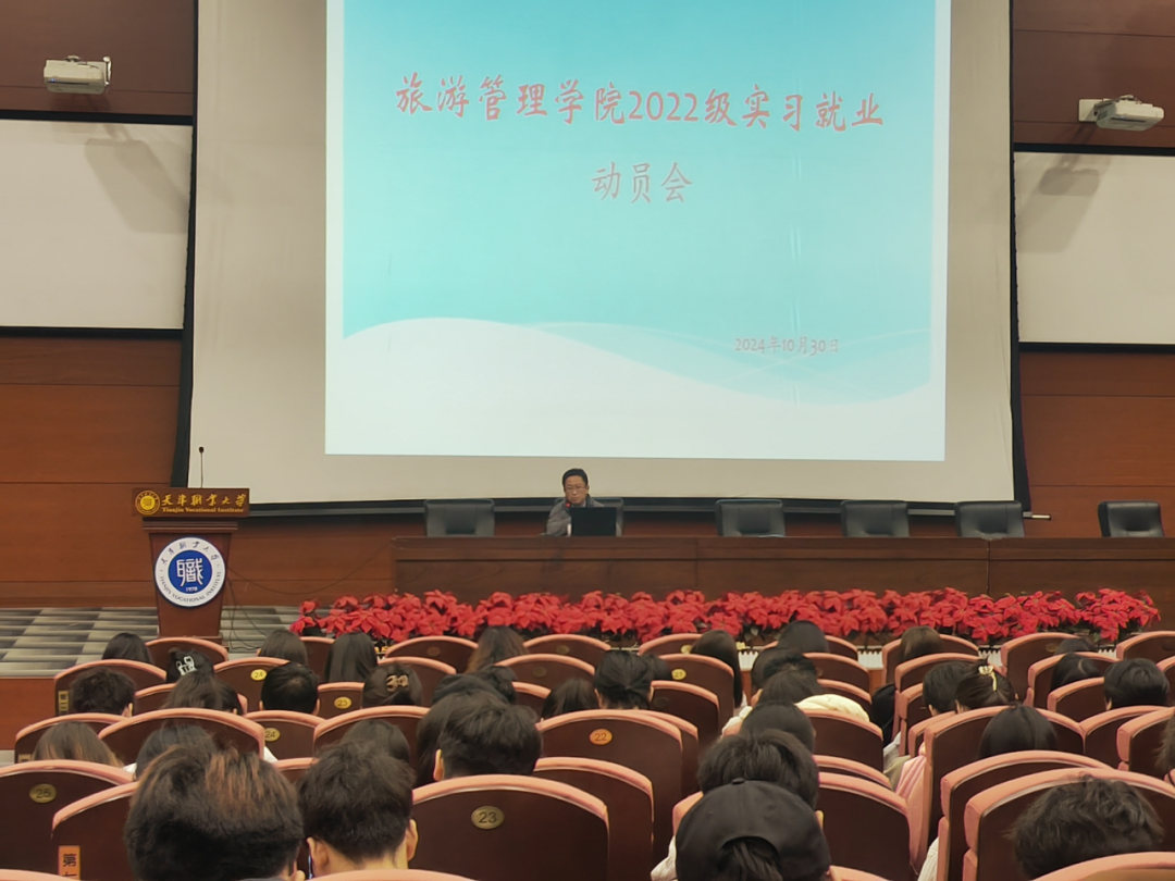 招聘会开始前旅游管理学院在报告厅召开了2022级实习就业动员会。动员会上王建新副院长首先进行了实习政策解读、实习前的安全培训,并且叮嘱同学们要诚信实习、诚信就业。晁小景老师就实习管理系统的具体使用进行了详细说明。甄伟丹老师为同学们讲解了就业相关政策、就业协议的签订流程。最后,李虹飞院长进行总结发言,对同学们提出了三点要求。一是要提高思想认识,要重视跟毕业相关的实习这门课、重视关系人生发展的就业这件事。二是要持之以恒,要适应从学校人到职场人的转变,在实习的岗位上坚持磨练自身,提升自身技能。三是要学会沟通。走上工作岗位,处理同事关系、上下级关系要以尊重为前提,学会耐心、有效的沟通。