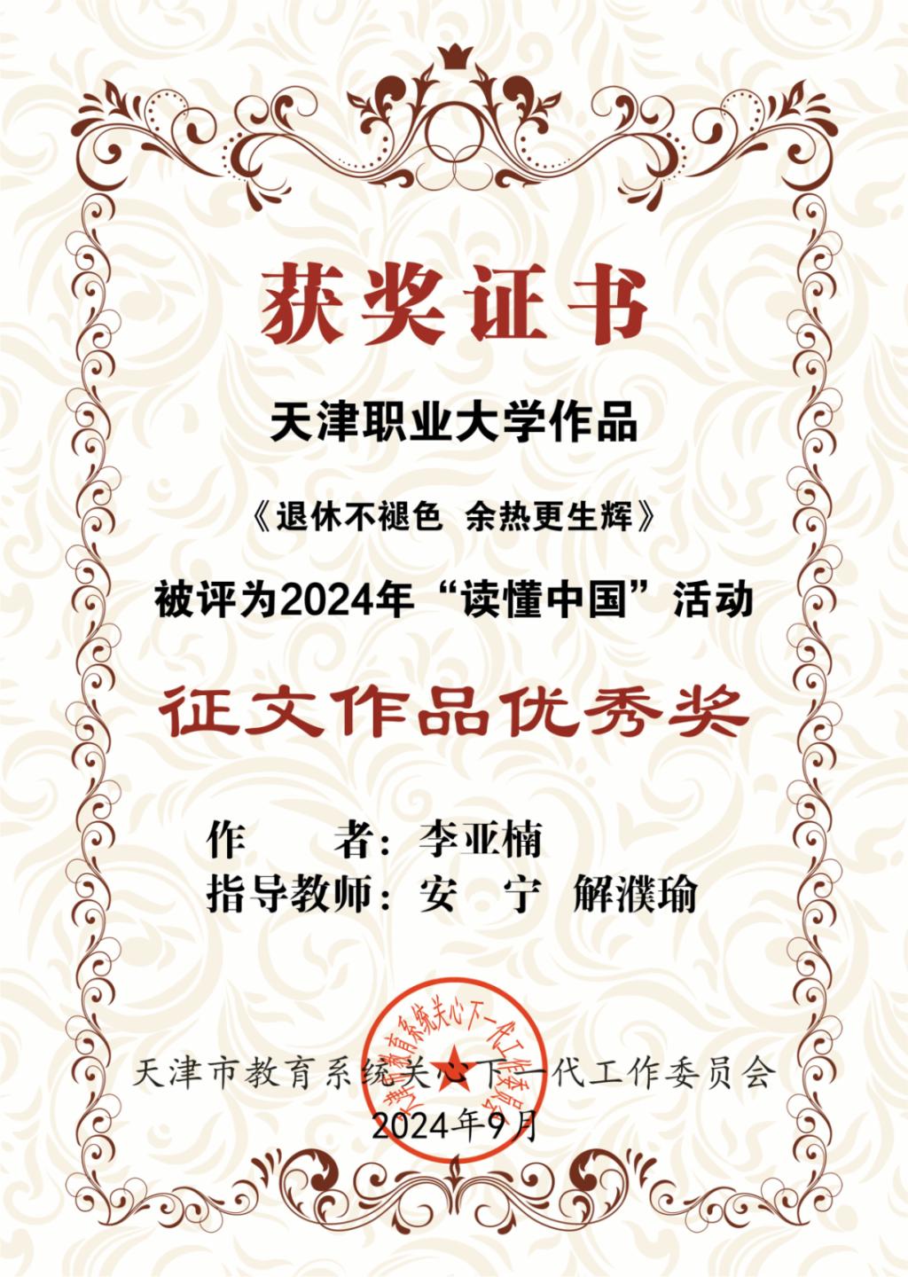 近日,天津市教育系统关工委下发了《关于公布了2024年“读懂中国”优秀作品评审结果的通知》,KY开元关工委报送的《我心目中的好老师》征文作品获得三等奖,《退休不褪色 余热更生辉》征文作品获得优秀奖。