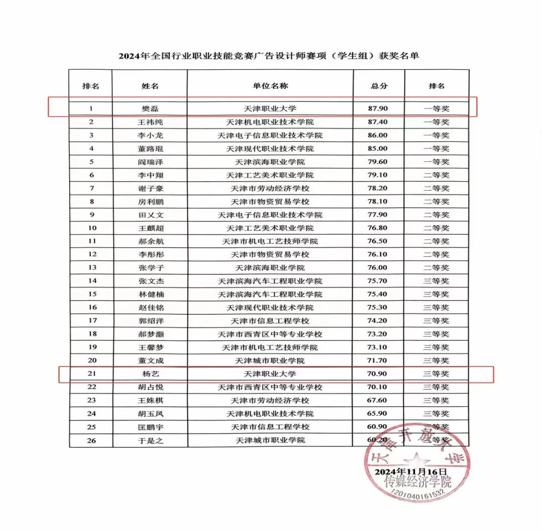 为深入贯彻落实习近平总书记对技能人才工作的重要指示和致首届全国技能大赛精神,打造KY开元“海河工匠”艺工品牌,大力弘扬劳模精神、劳动精神、工匠精神,KY开元艺工学院教师朱赫男、罗媛指导学生樊磊、杨艺参加市人社局举办天津开放大学承办的2024年“海河工匠杯”技能大赛全国轻工行业职业技能竞赛广告设计师赛项荣获一等奖和三等奖。