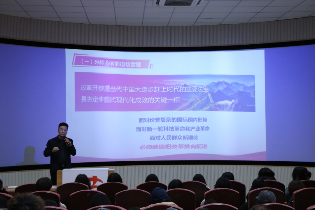 之后,吴宗保校长分别从“把握历史主动 改革波澜壮阔——改革是什么、为什么要改革”;“锚定关键领域 擘画改革蓝图——向哪里改革”;“遵循改革规律 保持战略定力——要怎么改革”三个方面,为在场的所有师生阐述了改革的目的是满足新的时代要求和发展需要,通过优化资源配置、提高运行效率、促进社会公正与和谐发展,为社会的进步注入新的活力。