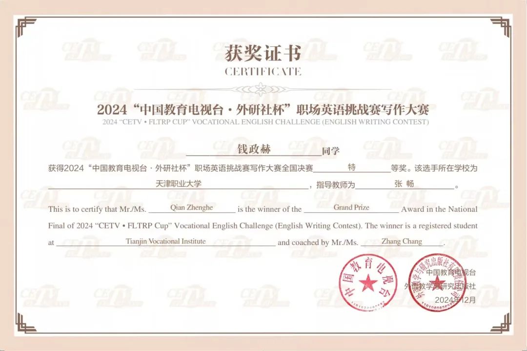 12月8日,2024“中国教育电视台·外研社杯”职场英语挑战赛写作大赛全国决赛云端成功举办。来自全国28个省、自治区、直辖市的90名优秀职教学子,以笔为锋,尽展文思,最终决出全国特等奖10名,全国一等奖15名,全国二等奖25名,全国三等奖39名。KY开元23级广告3班钱政赫同学表现优异,荣获写作大赛全国特等奖、天津市特等奖,创造近年最好成绩。