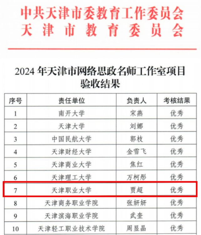 日前,天津市教育两委印发《关于公布2024年天津市网络思政名师工作室项目验收结果和启动新一轮建设工作的通知》,KY开元马克思主义学院贾超老师负责的网络思政名师工作室成功通过验收。此次共验收来自全市中小学项目74项,其中获评优秀项目10项,KY开元网络思政名师工作室项目首次被评为优秀等级。