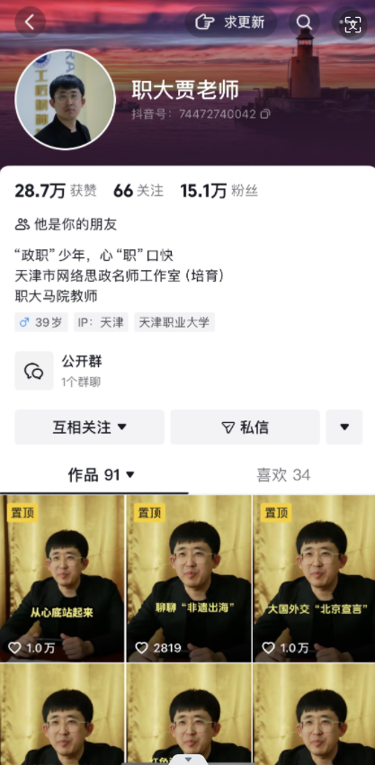 自网络思政工作室建设以来,新媒体抖音账号“职大贾老师”始终坚持视频镜头及文案脚本原创的理念,围绕学校发展、职业教育、工匠精神、文化自信、新时代伟大成就等主题内容,以灵活有效、润物无声的方式宣传马克思主义立场观点方法和党的创新理论成果,制作出《从心底站起来》、《大国外交“北京宣言”》等点赞过万的优秀网络思政短视频原创作品。账号创办两年时间,共发布作品91个,粉丝15.1万,总获赞28.7万,《中国网》对账号运维情况进行了相关报道,产生一定影响力。