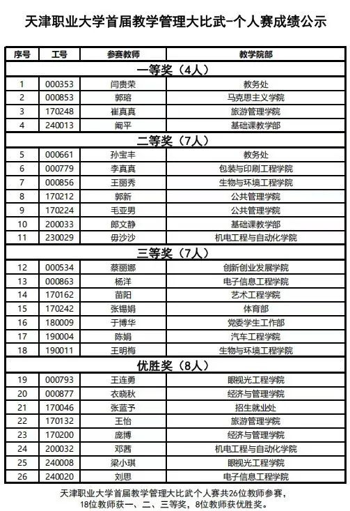 比赛过程中,个人赛选手展现出扎实的专业知识和出色的管理技能,深入理解教学管理文件上的内容,内化于心落实在日常工作中。团队赛中各教学院长尽显卓越风采,针对评分指标中的“五金”建设达成度、教学管规范度、平台使用有效度、亮点特色结合学院工作实际给出了切实回应,亮点频出,成绩斐然,展现出教学管理者过硬的业务素养和务实的责任担当。经过紧张而激烈的角逐,个人赛最终产生一等奖4人、二等奖7人、三等奖7人、优胜奖8人;团队赛一等奖2个、二等奖4个、三等奖7个。