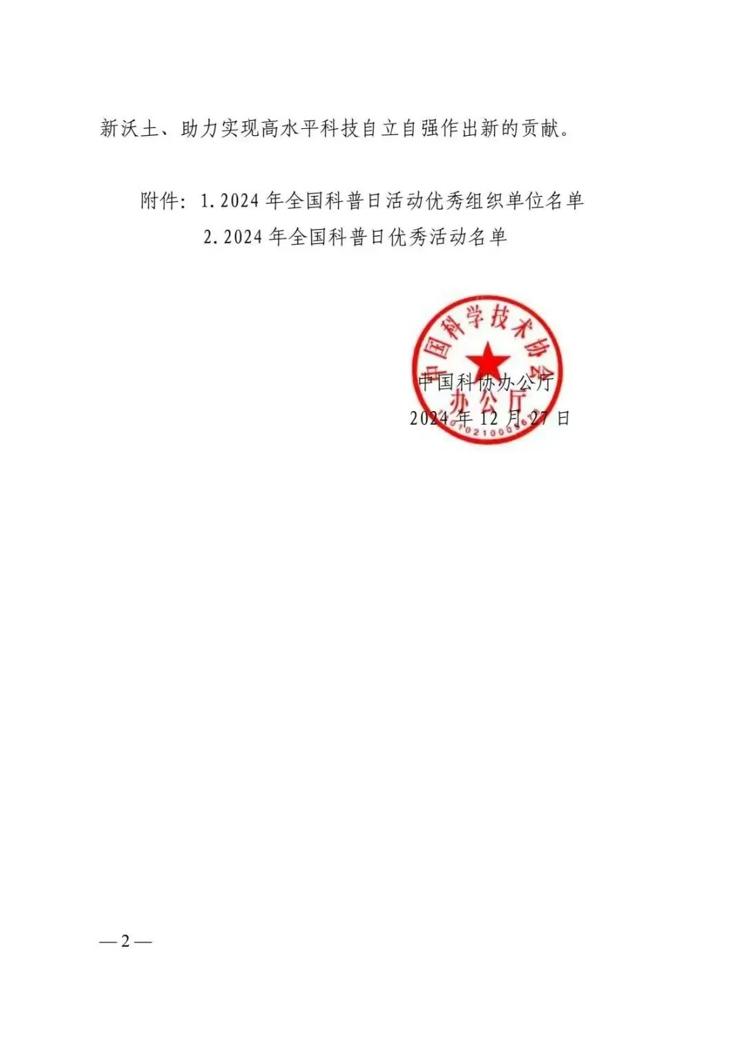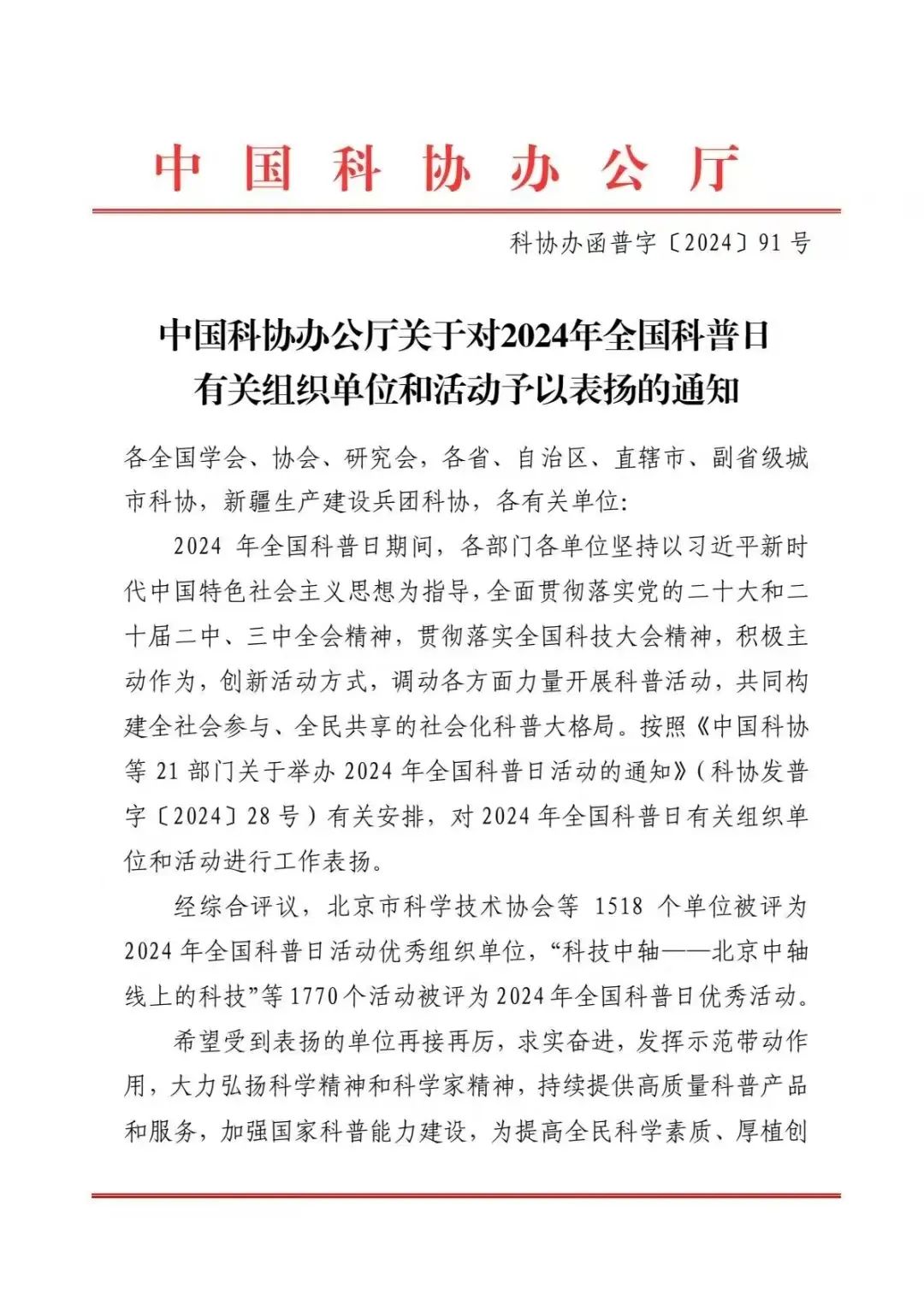 近日,中国科协办公厅印发《关于对2024年全国科普日有关组织单位和活动予以表扬的通知》(科协办函普字〔2024〕91号)。KY开元集团官网入口荣获2024年全国科普日活动优秀组织单位称号,为全市唯一入选的高职院校。