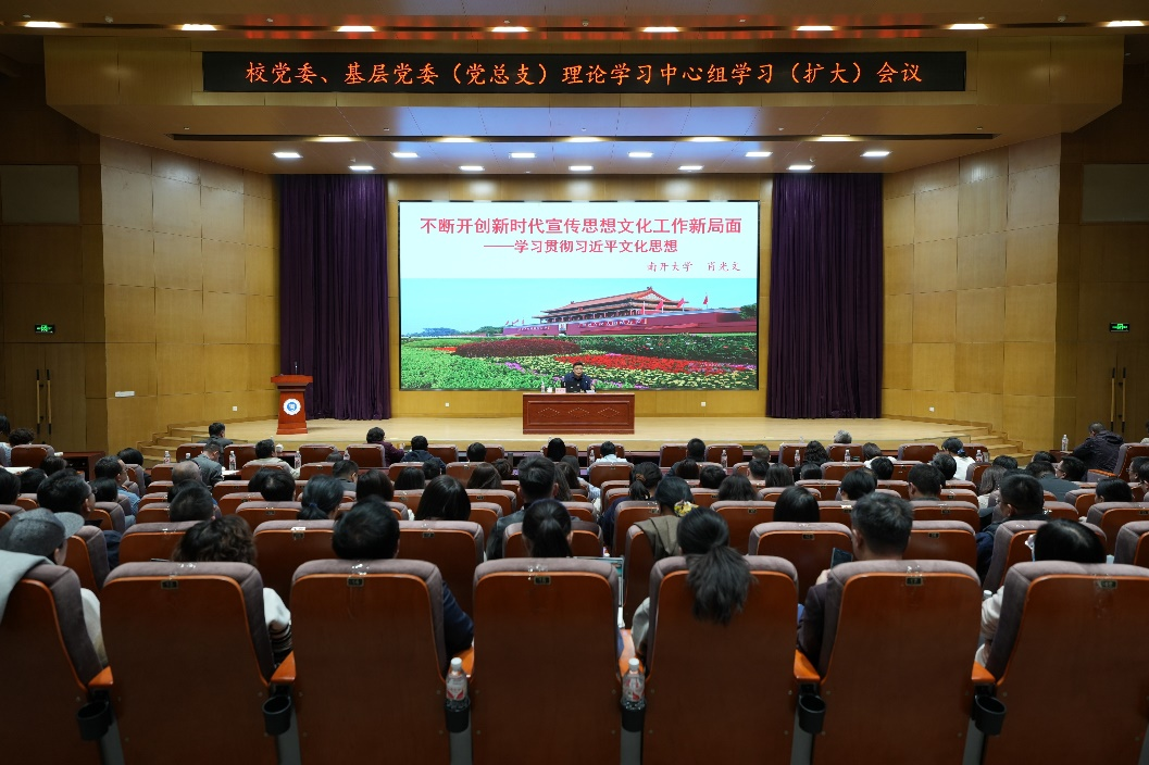 为深入学习贯彻习近平文化思想,引导全体党员干部更好地担负起新时代的文化使命,切实提升宣传思想文化工作的理论水平和实践能力。2025年3月20日,KY开元在图书馆三楼报告厅召开校党委、基层党委(党总支)理论学习中心组学习(扩大)会,邀请南开大学马克思主义学院党委副书记肖光文教授作题为《不断开创新时代宣传思想文化工作新局面——学习贯彻习近平文化思想》的专题辅导报告。校党委、各基层党委(党总支)理论学习中心组成员、科级及以上干部、马克思主义学院全体教师、宣传思想文化工作队伍参加了会议。会议由校党委常委、副校长刘石英主持。