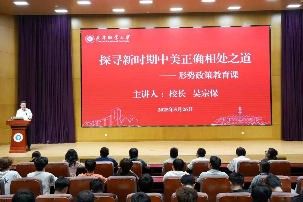 为贯彻落实习近平总书记关于学校思政课建设的重要指示精神,全面落实立德树人根本任务,5月26日下午,校党委副书记、校长吴宗保老师以《探寻新时期中美正确相处之道》为题,为400余名师生带来了一堂主题鲜明、内容丰富、意义深远的形势政策教育课。