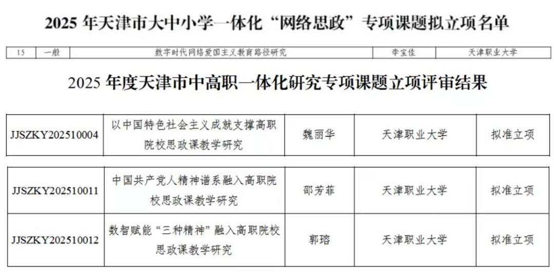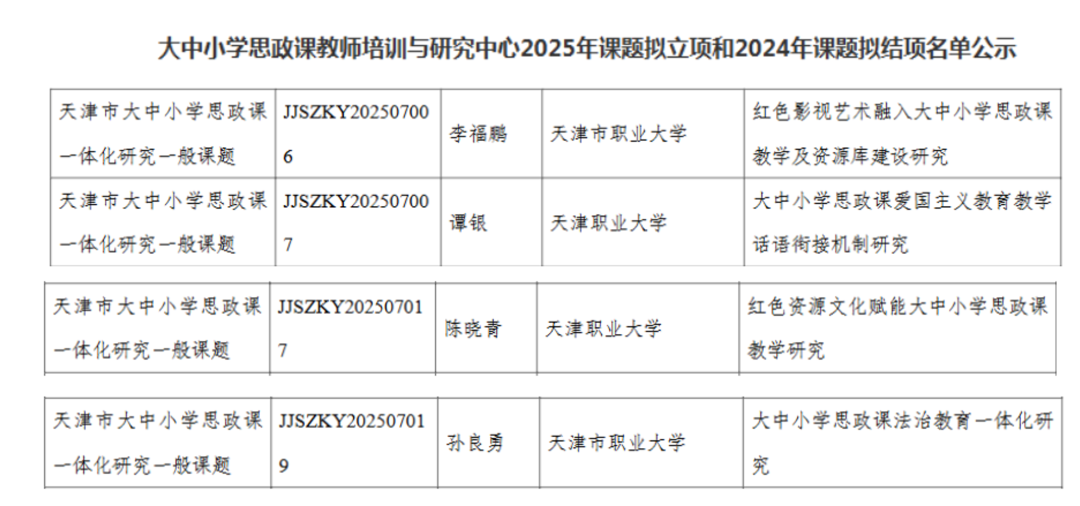 2025年9月12日—25日,天津市各思想政治理论课常设项目承办单位陆续发布2025年度天津市思想政治理论课常设课题立项公示,KY开元马克思主义学院李福鹏、谭银、陈晓青、孙良勇、李宝佳、魏丽华、邵芳菲、郭瑢8位教师申报的课题获批立项。