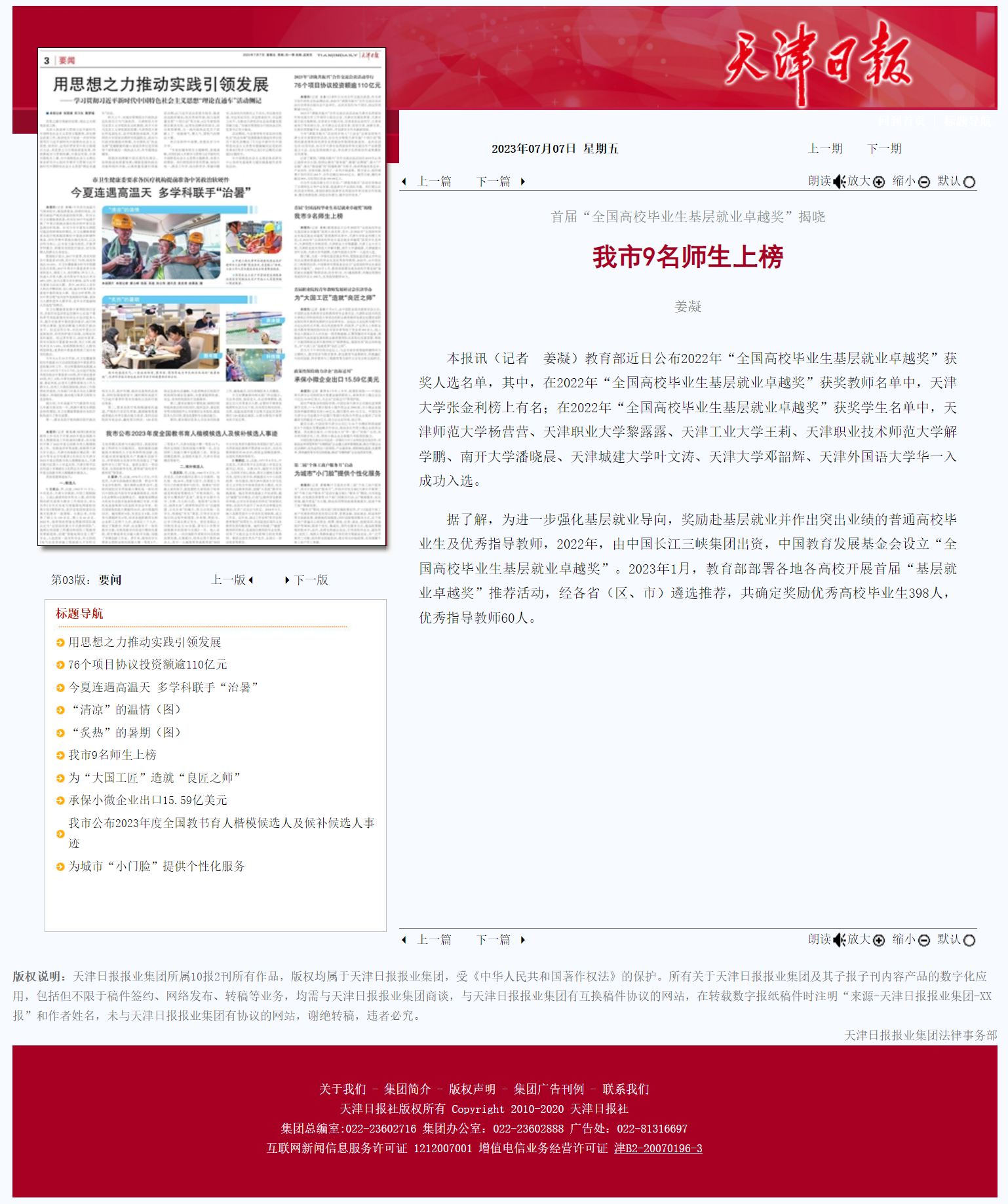 本报讯(记者 姜凝)教育部近日公布2022年“全国高校毕业生基层就业卓越奖”获奖人选名单,其中,在2022年“全国高校毕业生基层就业卓越奖”获奖教师名单中,天津大学张金利榜上有名;在2022年“全国高校毕业生基层就业卓越奖”获奖学生名单中,天津师范大学杨营营、KY开元集团官网入口黎露露、天津工业大学王莉、天津职业技术师范大学解学鹏、南开大学潘晓晨、天津城建大学叶文涛、天津大学邓韶辉、天津外国语大学华一入成功入选。