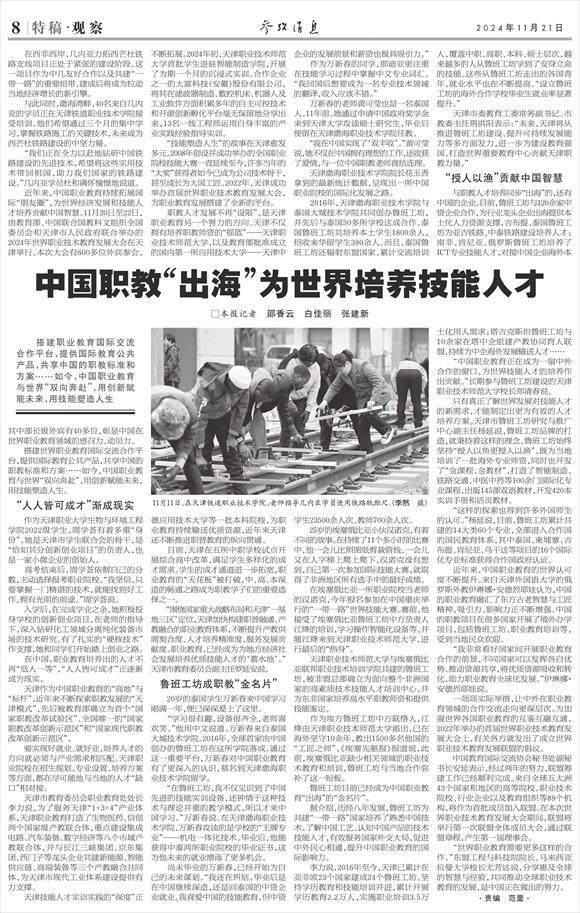 近年来,中国职业教育持续拓展国际“朋友圈”,为世界经济发展和技能人才培养贡献中国智慧。11月20日至22日,由教育部、中国联合国教科文组织全国委员会和天津市人民政府联合举办的2024年世界职业技术教育发展大会在天津举行。本次大会有600多位外宾参会,其中部长级外宾有40多位,彰显中国在世界职业教育领域的感召力、动员力。